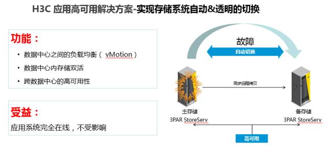 對于這一點,新華三推出了應(yīng)用高可用解決方案。這一方案的重點就是實現(xiàn)存儲系統(tǒng)自動、透明的切換。通過數(shù)據(jù)中心之間的負(fù)載均衡、數(shù)據(jù)中心內(nèi)存儲雙活、跨數(shù)據(jù)中心的高可用性等功能,讓金融應(yīng)用系統(tǒng)可以忽略外部故障影響,完全在線。